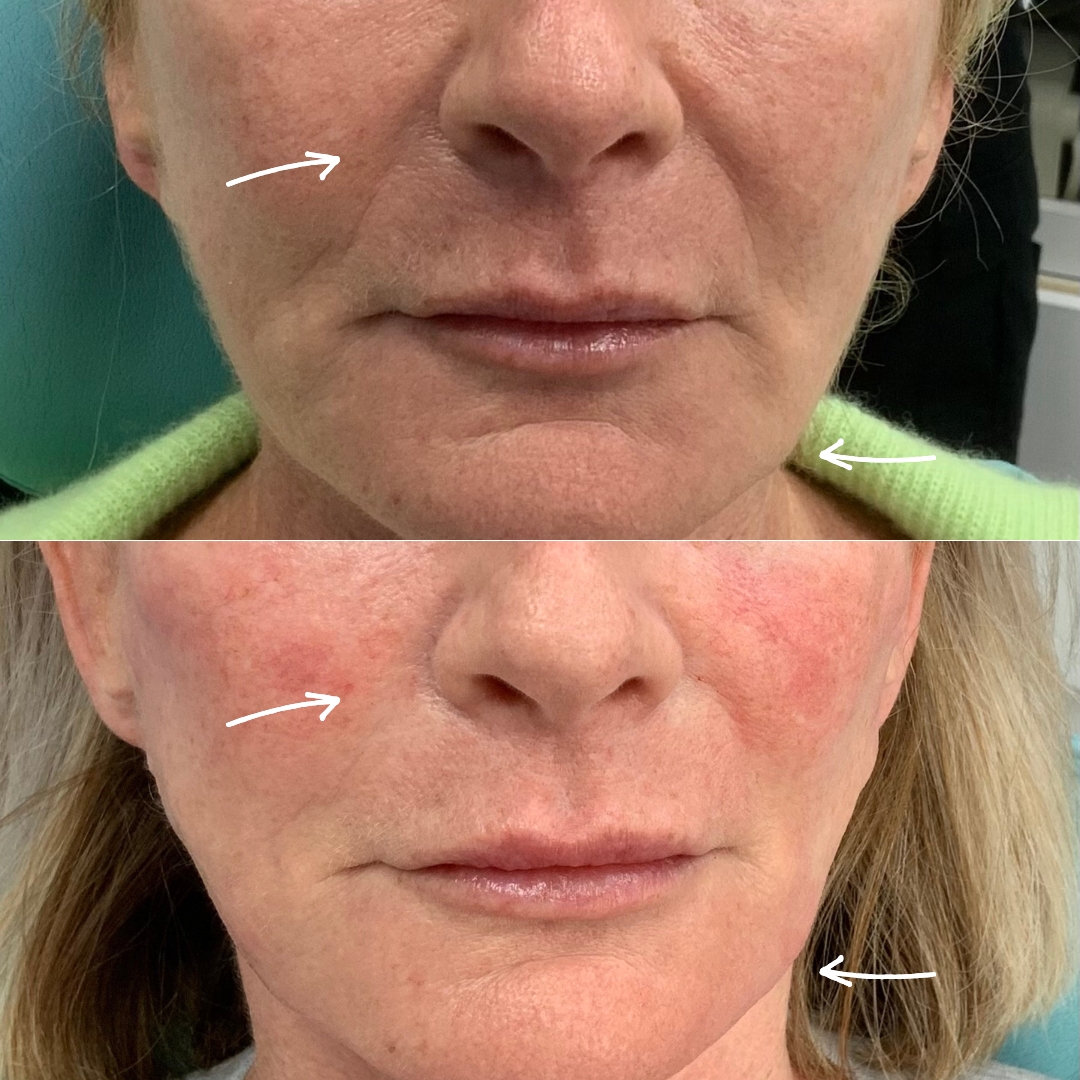 Skin often looks pink and fresher in the days after RF microneedling as circulation increases and surface texture begins to improve.